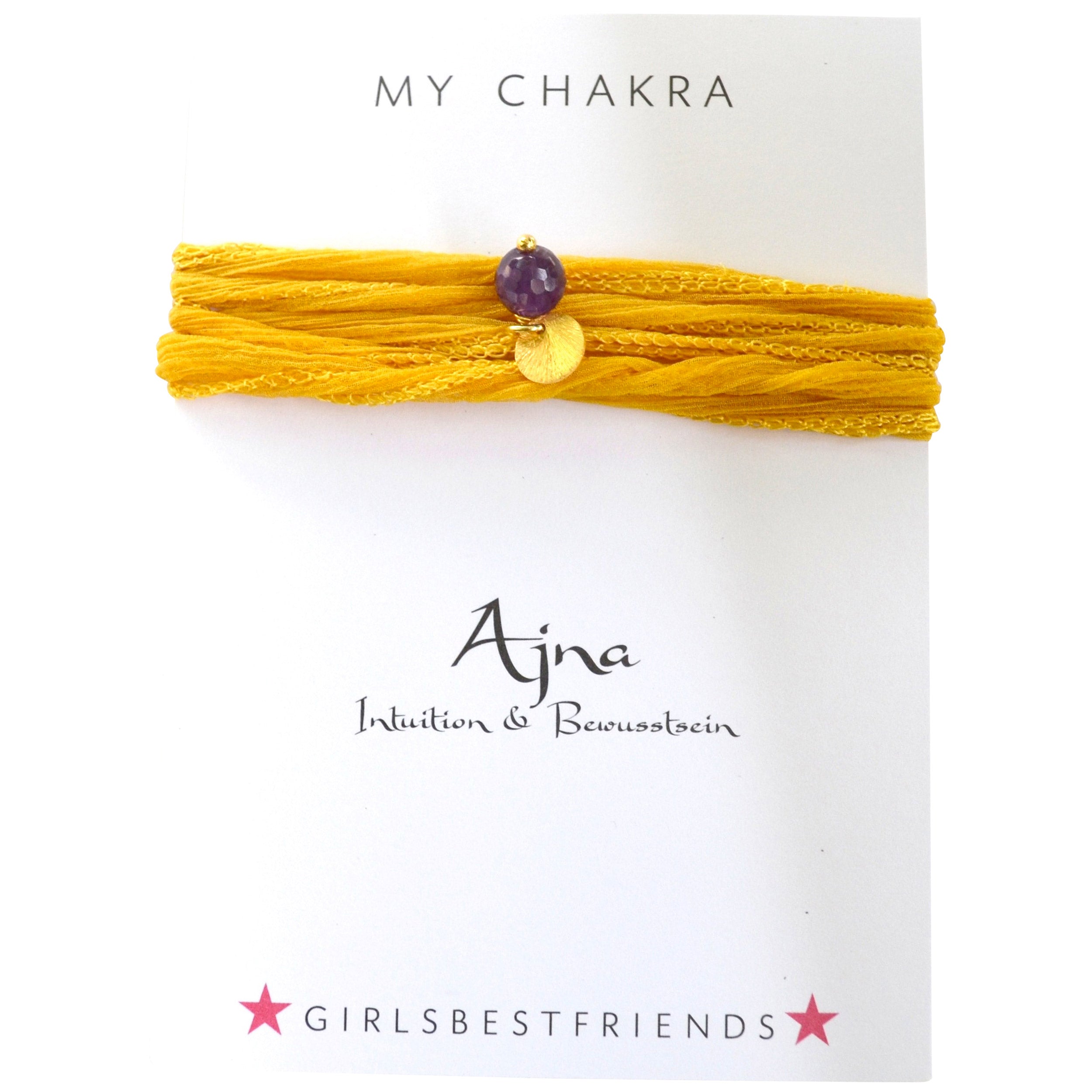 Wickel-Armband - Ajna (Amethyst): Öffne dein Stirn-Chakar und werde empfänglicher für intuitive Wahrnehmung. Lila Amethyst an einem zarten senfgelbem Seidenchiffon-Band und kleinem Plärrchen aus 925er-Silber, goldplattiert.