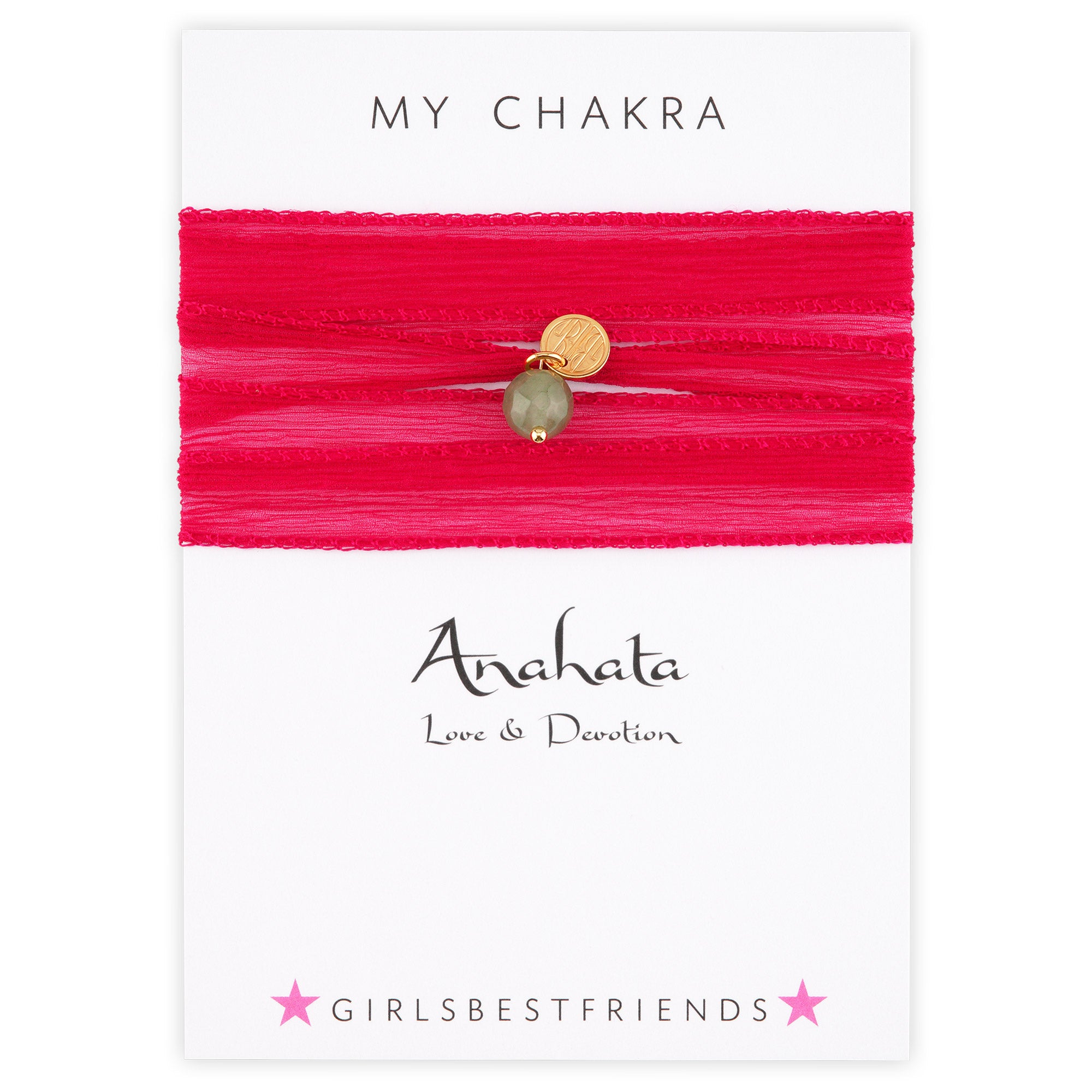 Wickel-Armband - Anahata (Aventurin): Grüner Aventurin an pinkfarbenem Seidenchiffon-Band (und kleinem Plättchen aus 925er-Silber, goldplattiert) hilft dir dabei, dein Herz-Chakra zu öffnen und Liebe, Hingabe und Achtsamkeit zu allen Lebewesen zu fühlen.