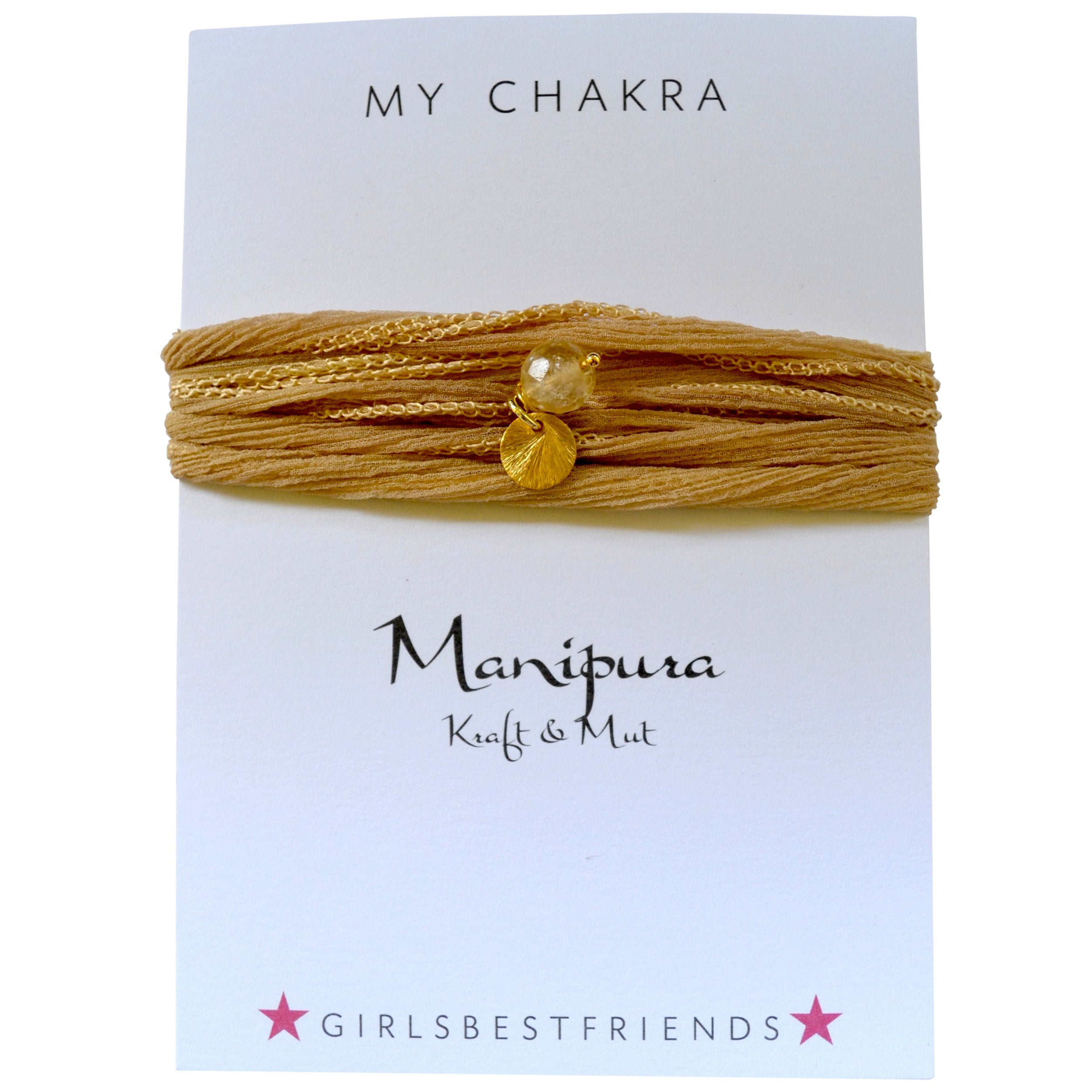 Wickel-Armband - Manipura (Citrin): Aktiviere dein Manipoura und damit deinen Mut und deine Willenskraft. Citrin an einem zarten nude-farbenen Seidenchiffon-Band und kleinem Plättchen aus 925er-Silber, goldplattiert.