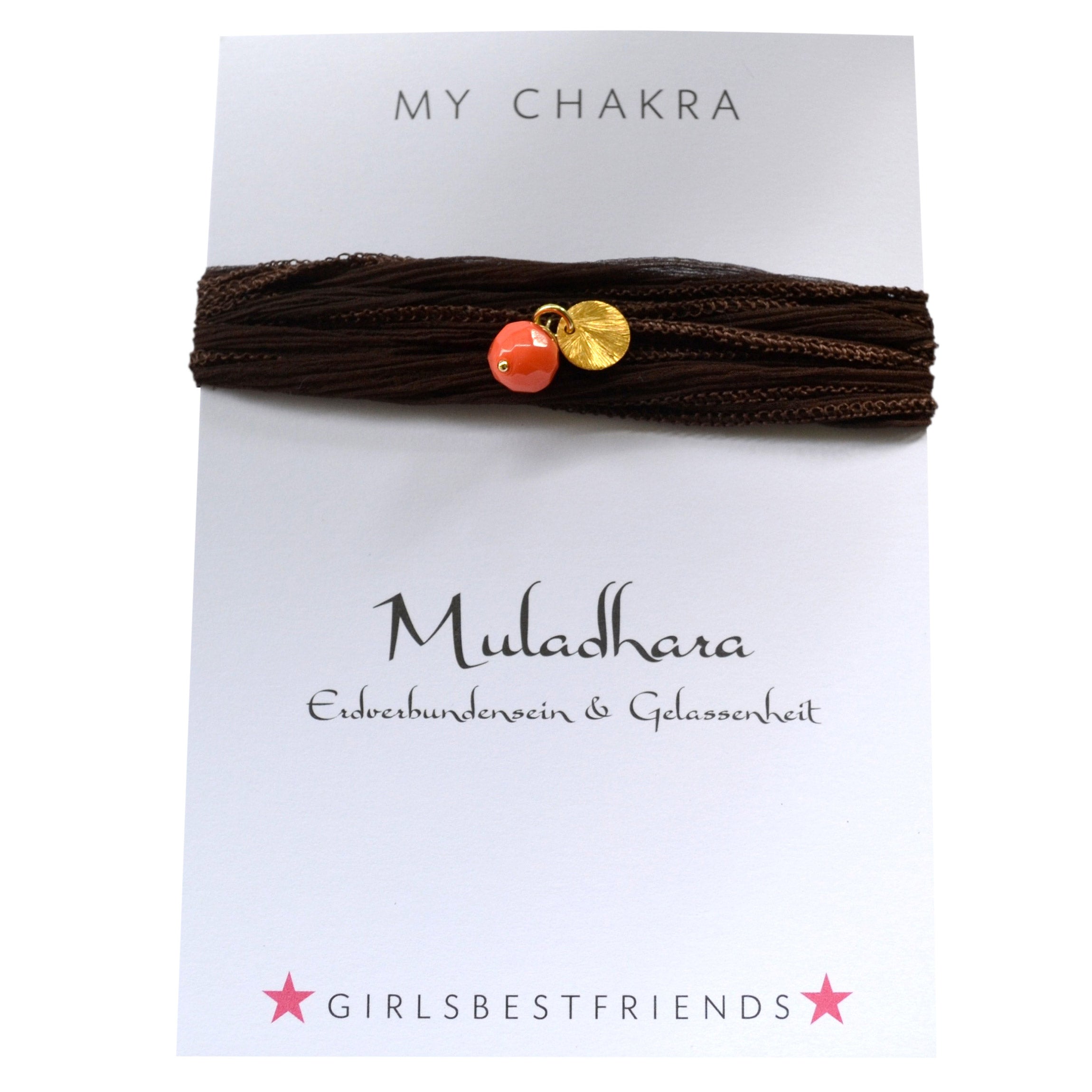 Wickel-Armband - Muladhara (Koralle): Verbinde dich mit Muladhara - dem Wurzelchakra - energetisch mit der Erde und sie schenkt dir Urvertrauen und Gelassenheit. Koralle an einem zarten nougat-farbenen Siedenchiffon-Band und kleinem Plättchen aus 925er-Silber, goldplattiert.