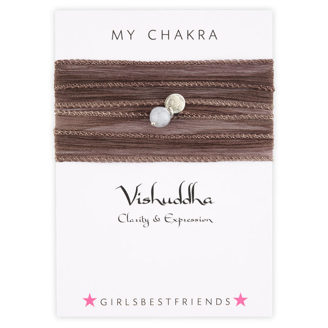 Wickel-Armband - Vishuddah (Blauer Chalzedon): Aktiviere dein Kehl-Chakra mit blauem Chalzedon an mauvefarbenem Seidenchiffon-Band (und kleinem Plättchen aus 925er-Silber) und du erlangst die Fähigkeit, deinen Gedanken und Gefühlen klar und wahrheitsgemäß, bspw. auch über Gesang oder Kunst, Ausdruck zu verleihen.