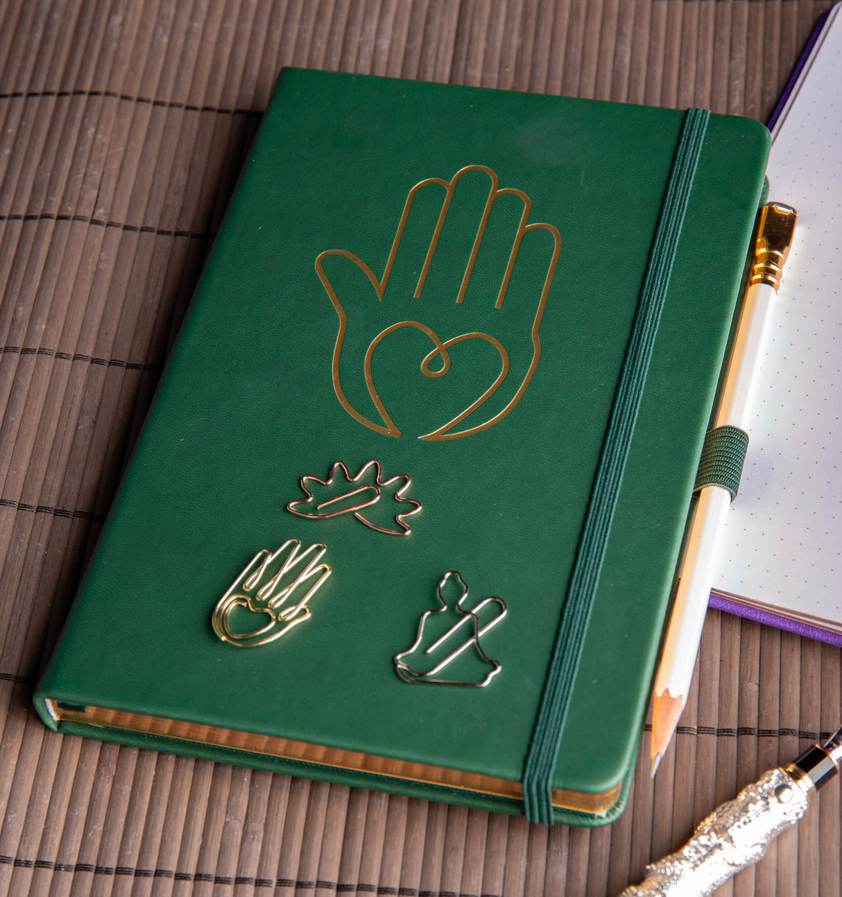 Edles Schreibbuch für besondere Zwecke. Dieses elegante Schreibbuch ist in Kunstleder gebunden, mit großen Buddhas Hand im Golddruck. Die Blattränder sind zusätzlich mit Gold metallisiert. Das Buch ist liebevoll in Seidenpapier eingepackt und kommt in seiner eigenen bedruckten Schachtel, welche zusätzlich drei Paperclips mit Symbolkraft enthalten.