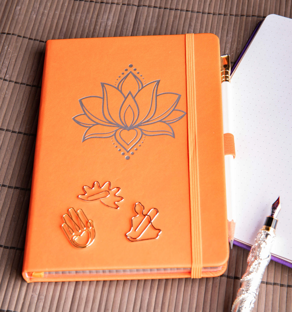 Dieses elegante Schreibbuch ist in Kunstleder gebunden, mit großen Lotus im Silberdruck. Die Blattränder sind zusätzlich mit Silber metallisiert. Das Buch ist liebevoll in Seidenpapier eingepackt und kommt in seiner eigenen bedruckten Schachtel, welche zusätzlich drei Paperclips mit Symbolkraft enthalten.