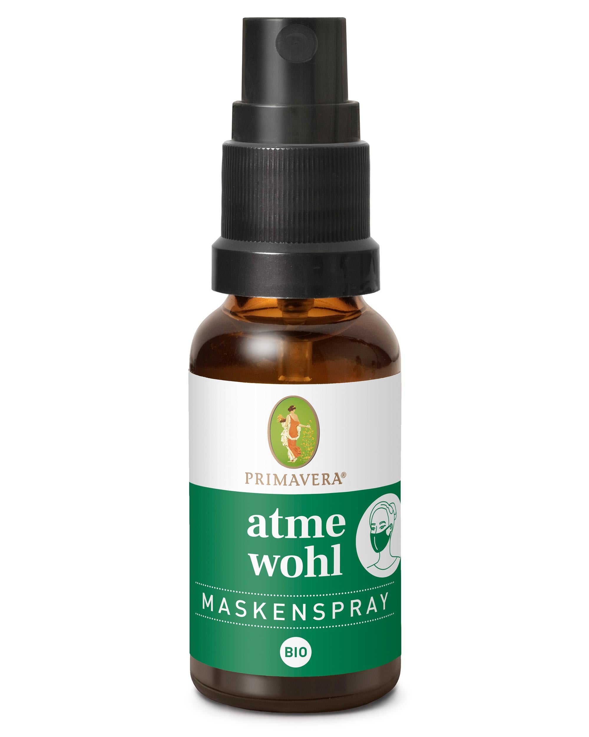Das befreiende und stärkende Atmewohl Maskenspray bio mit minzig-frischem Duft naturreiner ätherischer Öle und Pflanzenwässer von Spearmint, Orange, Lavendel, Hamamelis und Cistrose. Das Maskenspray erleichtert das Tragen von Masken, lindert Beklemmungsgefühle und hilft dabei, besser durchatmen zu können. Das Tragen einer Mund-Nasen-Bedeckung in Form von Masken (auch Mund-Nasen-Bedeckung oder Community Maske genannt) gehört inzwischen auch in Europa zum Alltag und wird voraussichtlich auch längerfristig ein Alltagsgegenstand sein. Viele Menschen empfinden das Tragen dieser Masken als unangenehm, weil Masken das Durchatmen erschweren. Mancher empfindet Beklemmungsgefühle. Das Atmewohl Maskenspray bio ist auf diese Bedingungen abgestimmt und macht das Tragen von Masken angenehmer. Einfach schütteln, außen auf die Maske aufsprühen und gut trocknen lassen, dann wie gewohnt aufsetzen. In einer 20 ml-Glasflasche ideal zum Mitnehmen und für unterwegs.