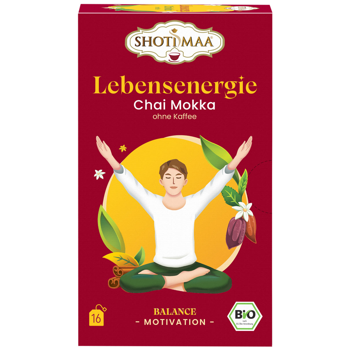 Gönne dir einen Tag voller Harmonie mit der ayurvedischen Bio-Kräuter- und Gewürzteemischung Shoti Maa Lebensenergie Chai Mokka.