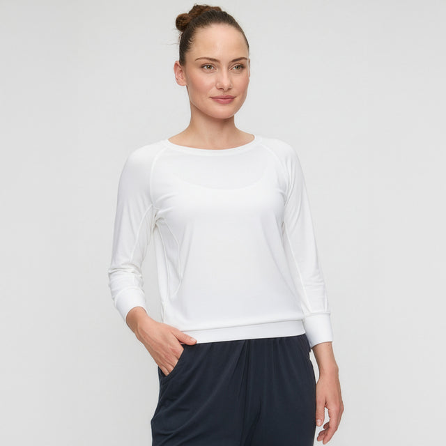 Ein breites Bündchen, 3/4 Ärmel und der große Ausschnitt: dieses Shirt ist genau so bequem wie es aussieht und möchte nicht nur auf der Matte getragen werden.