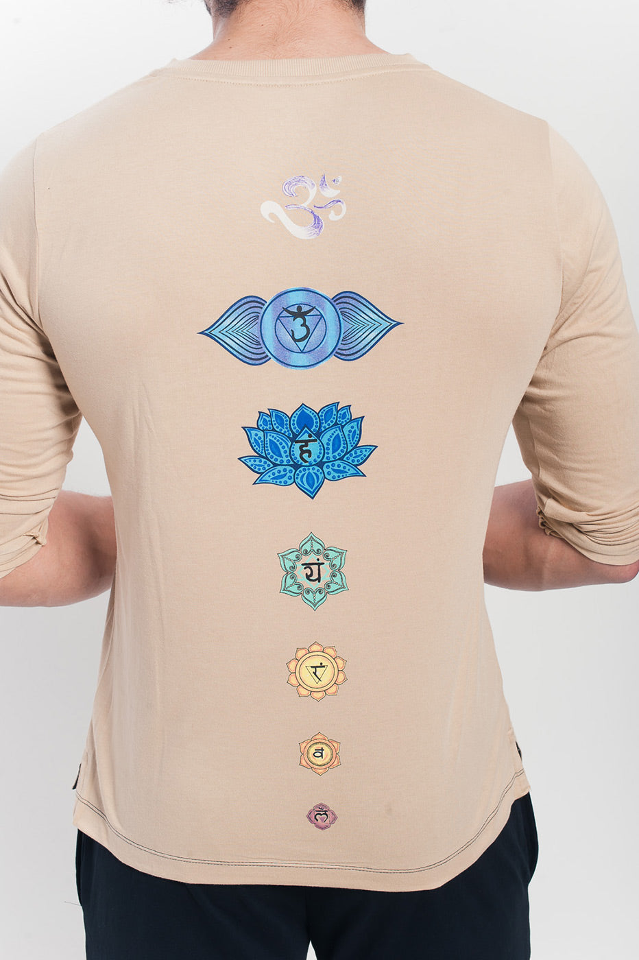 Das Yoga-Shirt besteht aus feinstem Modal und aus Bio-Baumwolle für echten Komfort und viel Bewegungsfreiheit. Die langen Ärmel schmiegen sich gut an und können aufgerollt und mit den integrierten Knöpfen befestigt werden. Sowohl Textur als auch Farben sind einfach zum Verlieben. Zudem hat dieses Männer-Shirt von Hand entworfene Chakra-Prints in den Originalfarben der Chakras, die hinten an der Wirbelsäule angeordnet sind und deren Bewegung während der Praxis betonen.