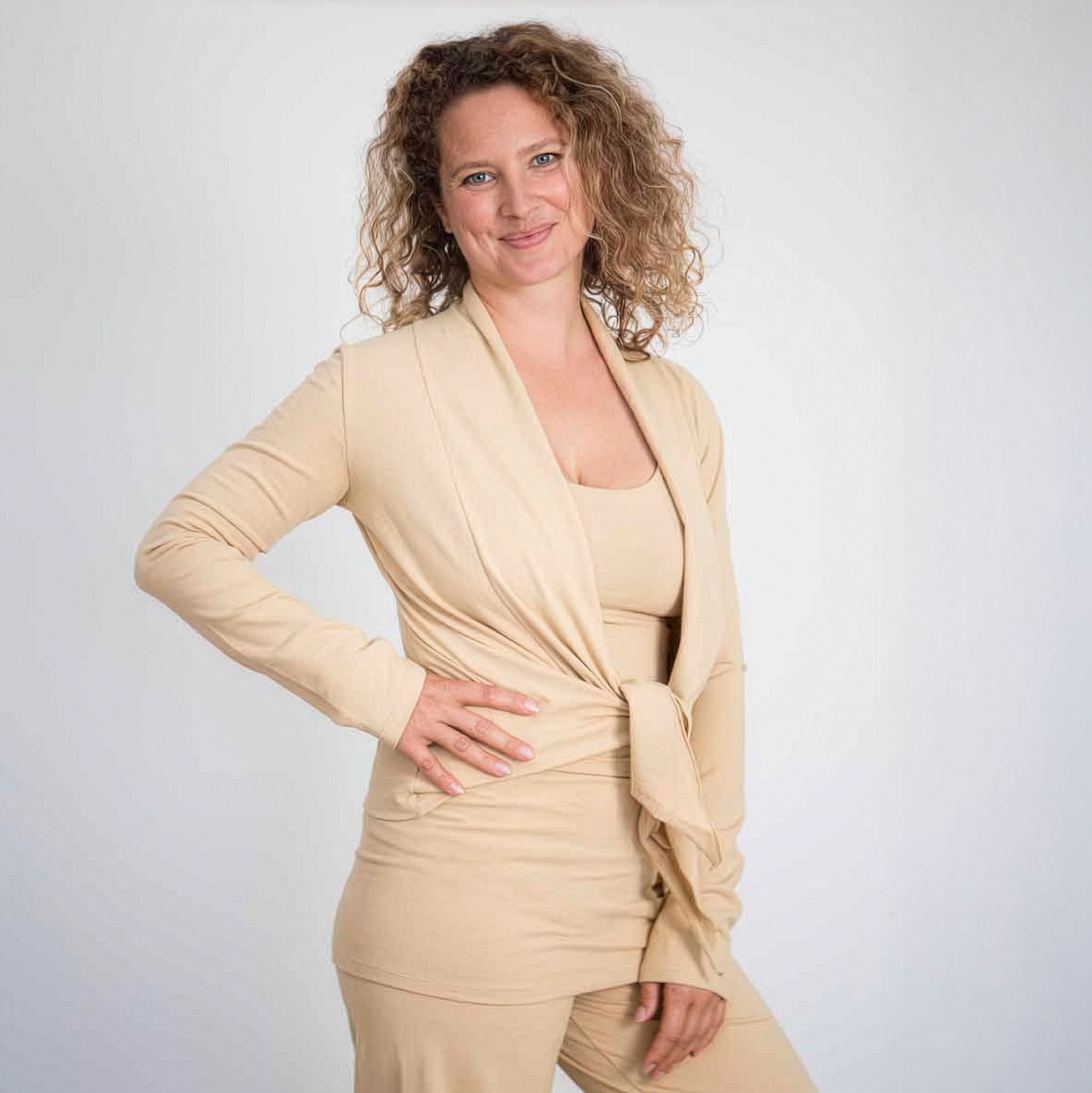 Developed primarily for yoga and Pilates, this jacket also offers room for movement with an optimal fit for all other sports and leisure activities. The jacket is worn open or loosely knotted at the front and can also be knotted crossed at the back for slim women.