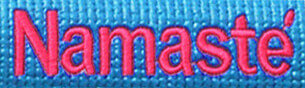 Sangle de yoga en coton, avec boucle en plastique noire et broderie personnalisée.